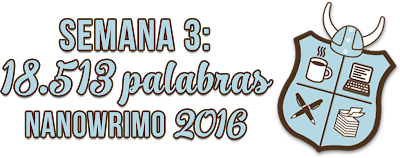 Esta semana, como podéis ver si comparáis con la anterior, he avanzado bastante en las palabras del reto aunque sigo bastante por detrás de lo que debería. Sé que queda poco tiempo pero sigo sin desanimarme y con ganas de seguir avanzando el reto. La verdad es que hace tiempo que dejé de preocuparme si llegaría a las 50.000 palabras o no, solo quiero seguir pasándomelo bien escribiendo y seguir avanzando esta historia y poder continuarla más adelante.